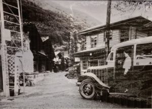 筑摩鐡道の終点「島々」には、アルプスの本場北部ヨーロッパ調の瀟洒な駅舎が建てられました。上高地方面へのバス(乗合自動車)運行は、島々線開業に先立つ大正7(1918)年より、松本=奈川度間で始まっており、その後、昭和4(1929)年には上高地(大正池)への乗り入れが実現しました。バスの開通により、同駅は名実ともに”山の玄関口”としての役割を果たすようになります。 |