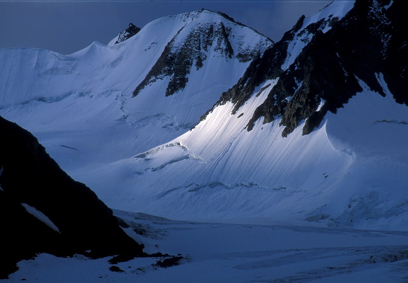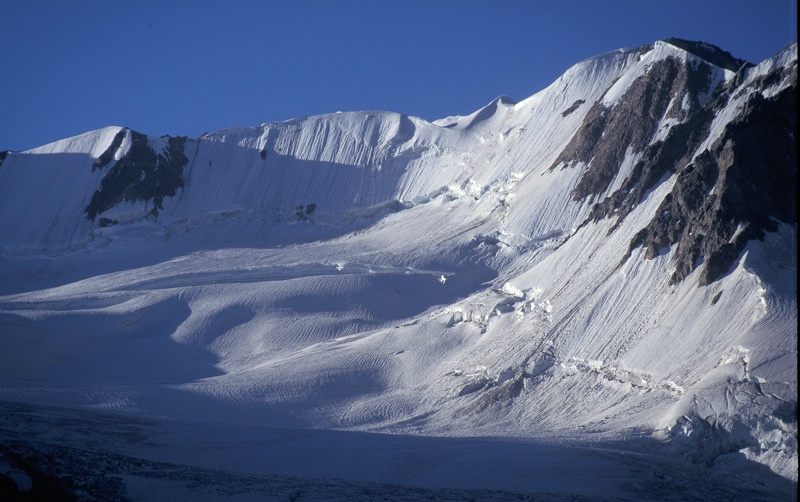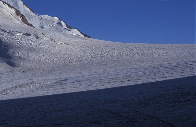 ダルコット峠④ ヒマラヤ襞・風紋 凍てつく寒さと急斜面が美しい襞を作る 4000m以上でみられる (86-32) 朝日に輝く氷河 (86-10) 陽が昇ると (84-33) 雪面に、風が作る縞が (84-30) 氷河へ (84-27) スポットライトが (581-10) つづく 戻る